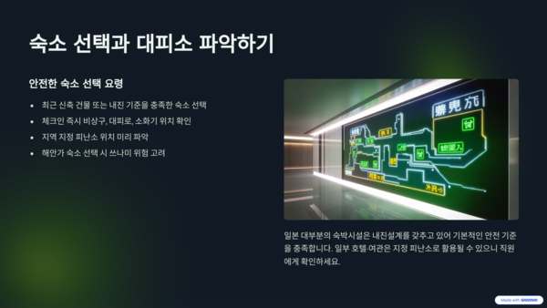 - 최근 신축 건물 또는 내진 기준을 충족한 숙소 선택