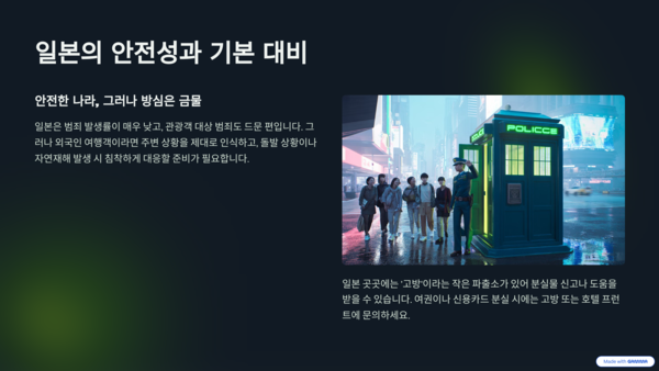 일본은 범죄 발생률이 매우 낮고, 관광객 대상 범죄도 드문 편입니다. 그렇다고 방심해선 안 됩니다. 외국인 여행객이라면 주변 상황을 제대로 인식하고, 돌발 상황이나 자연재해 발생 시 침착하게 대응할 준비를 해두는 것이 좋습니다.