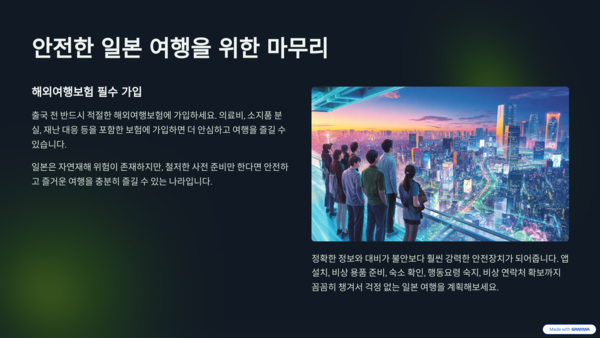 일본은 자연재해 위험이 분명 존재하지만, 철저한 사전 준비만 한다면 안전하고 즐거운 여행을 충분히 즐길 수 있는 나라입니다. 정확한 정보와 대비가 불안보다 훨씬 강력한 안전장치가 되어줍니다. 앱 설치, 비상 용품 준비, 숙소 확인, 행동요령 숙지, 비상 연락처 확보까지 꼼꼼히 챙겨서 걱정 없는 일본 여행을 계획해보세요.