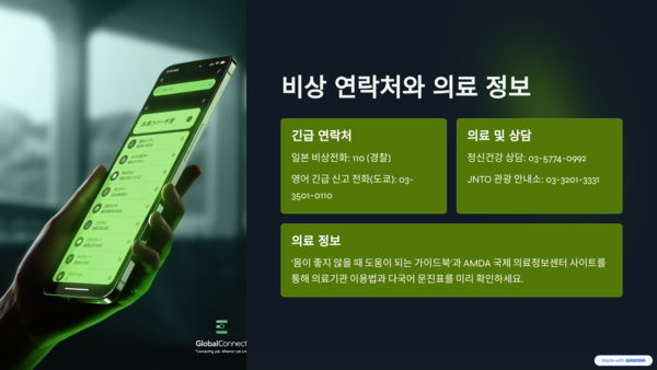 또한, '몸이 좋지 않을 때 도움이 되는 가이드북'과 AMDA 국제 의료정보센터 사이트를 통해 의료기관 이용법과 다국어 문진표를 미리 확인해두면 도움이 됩니다.